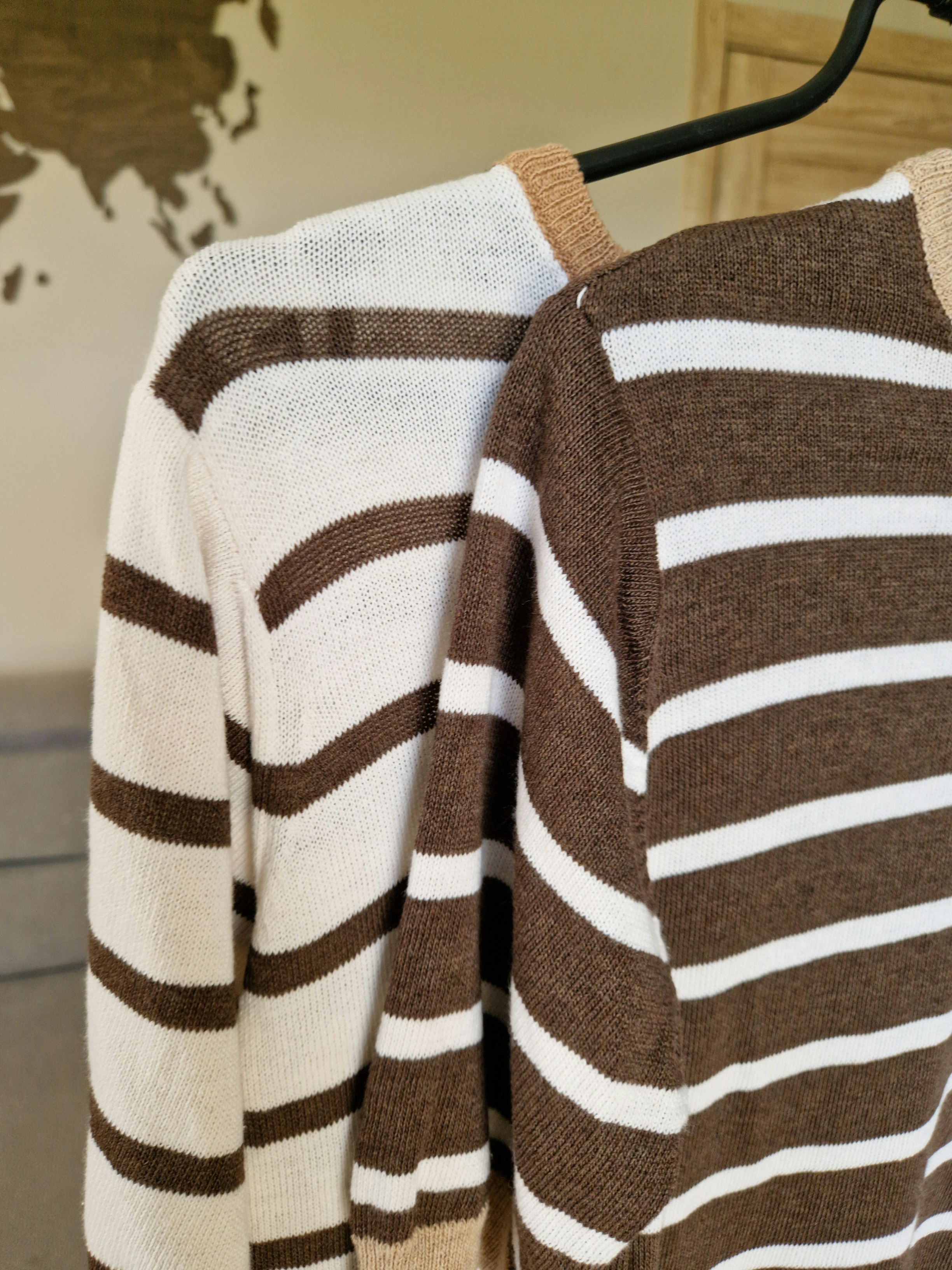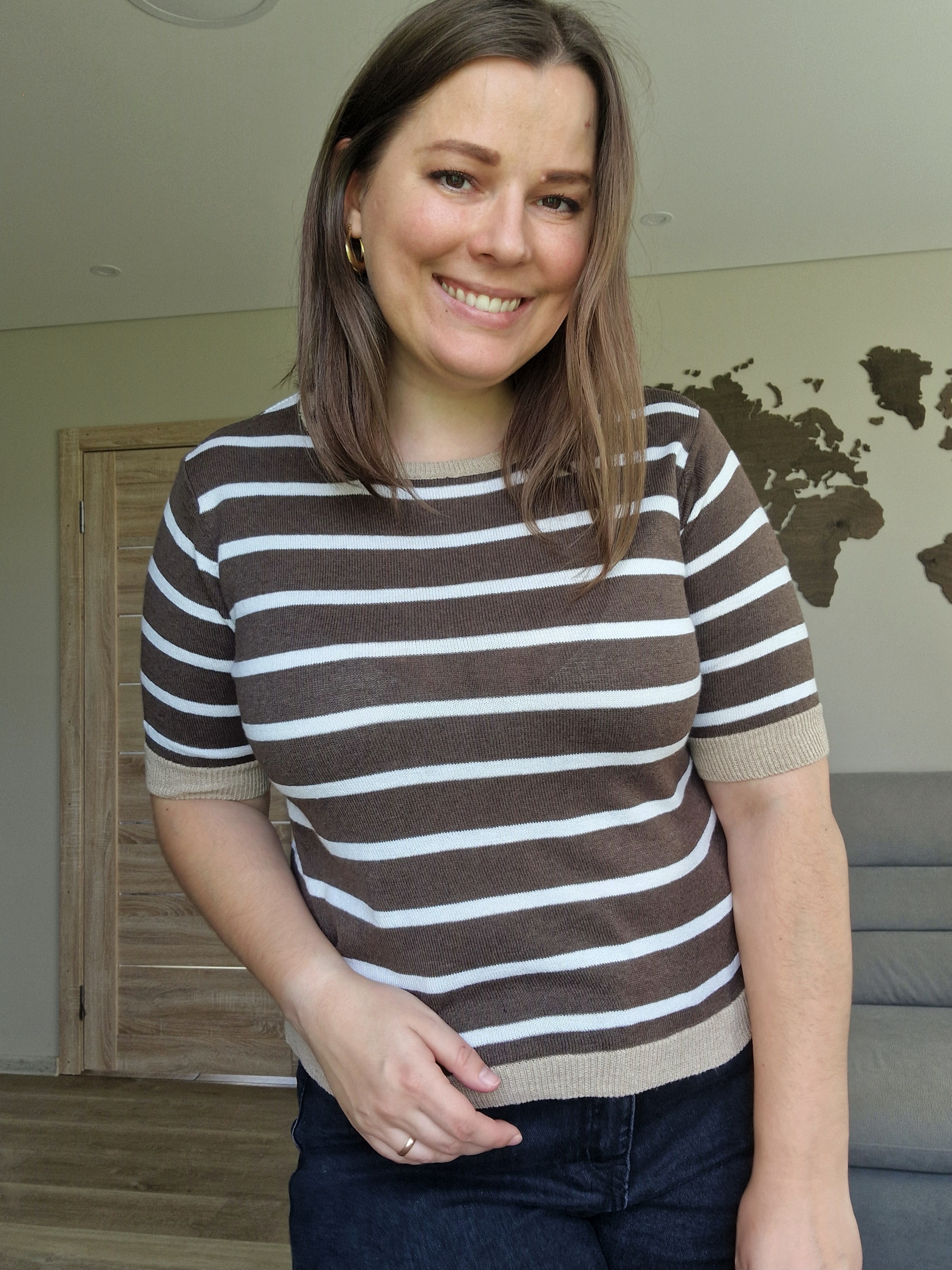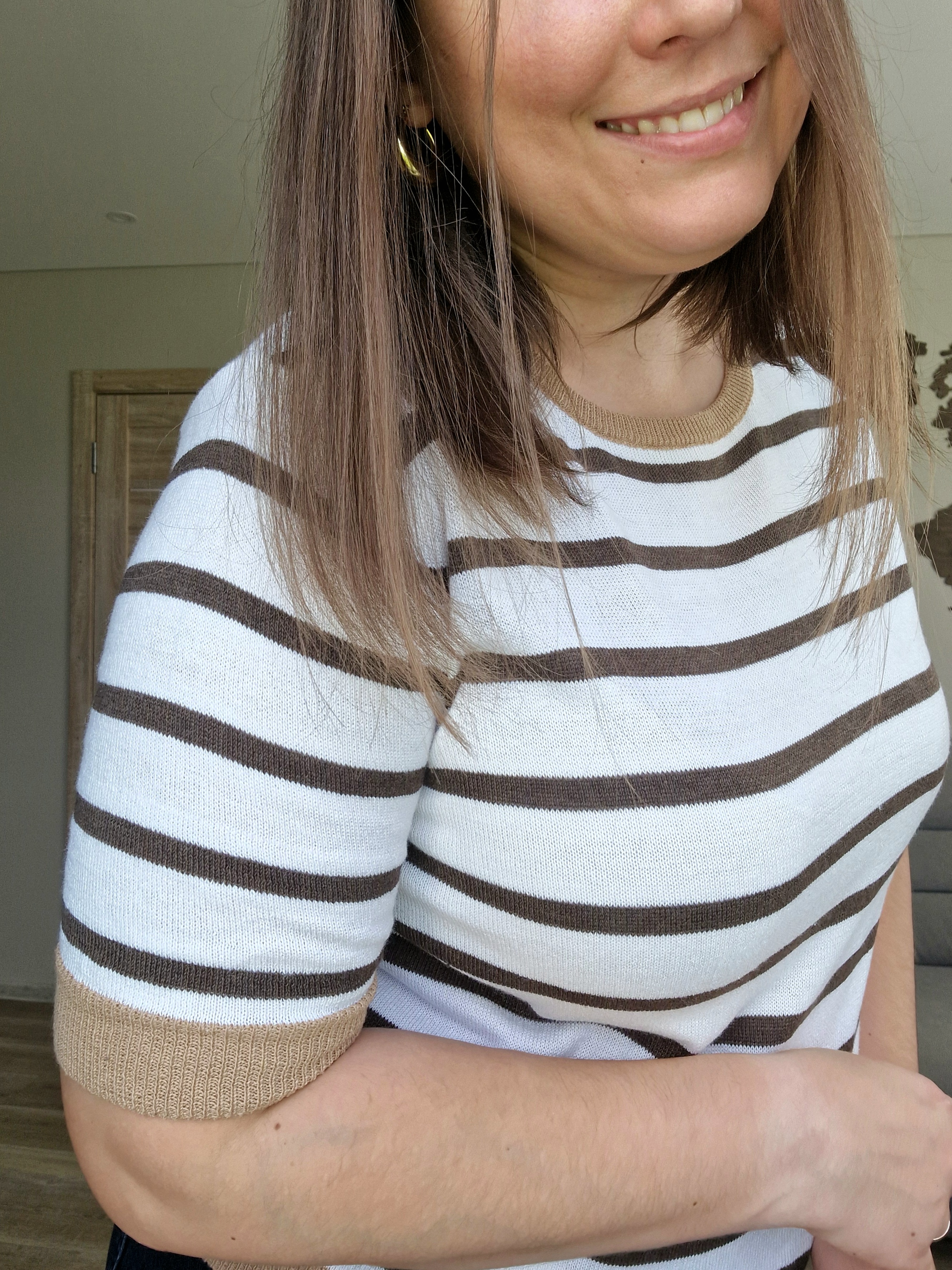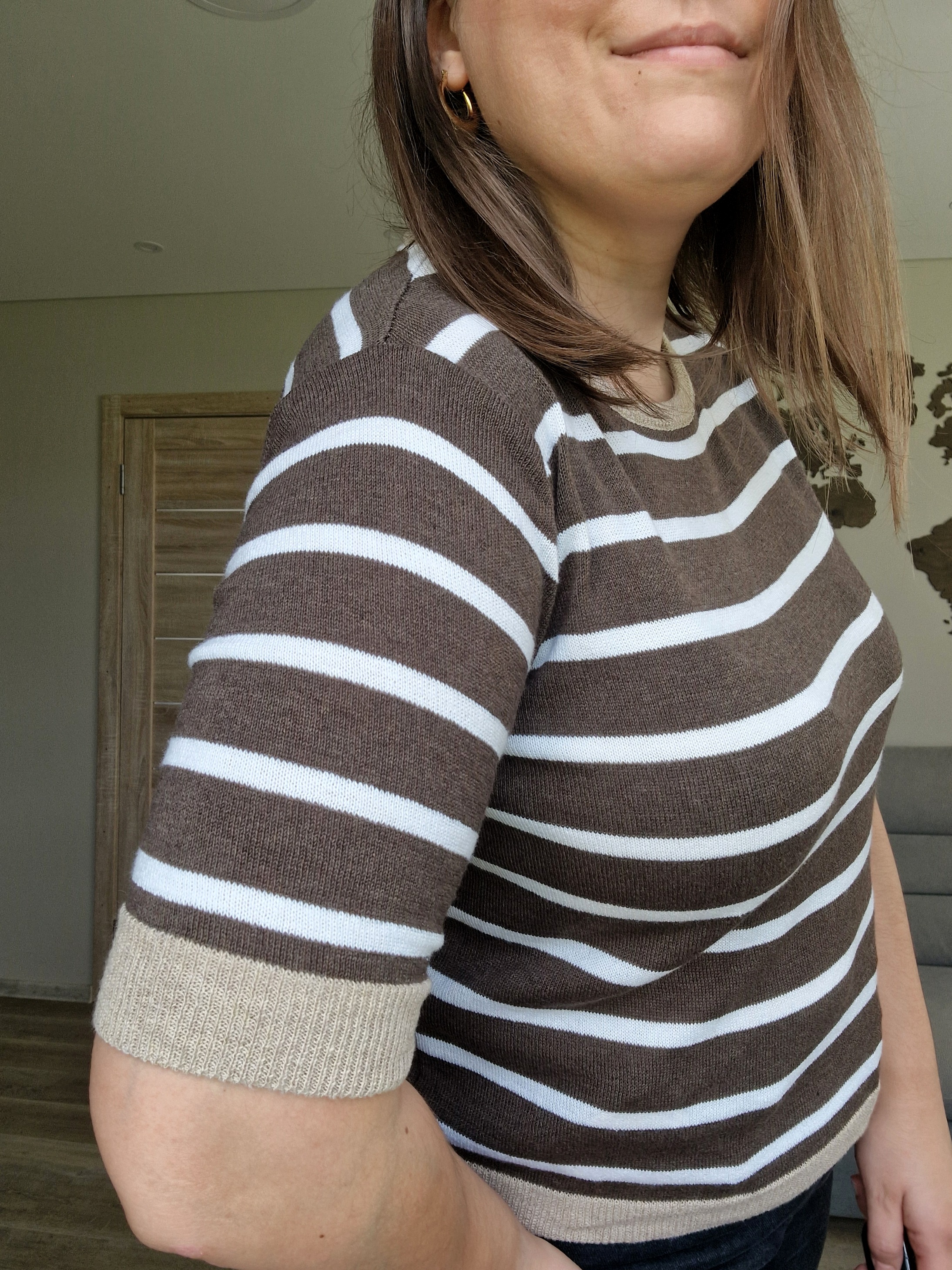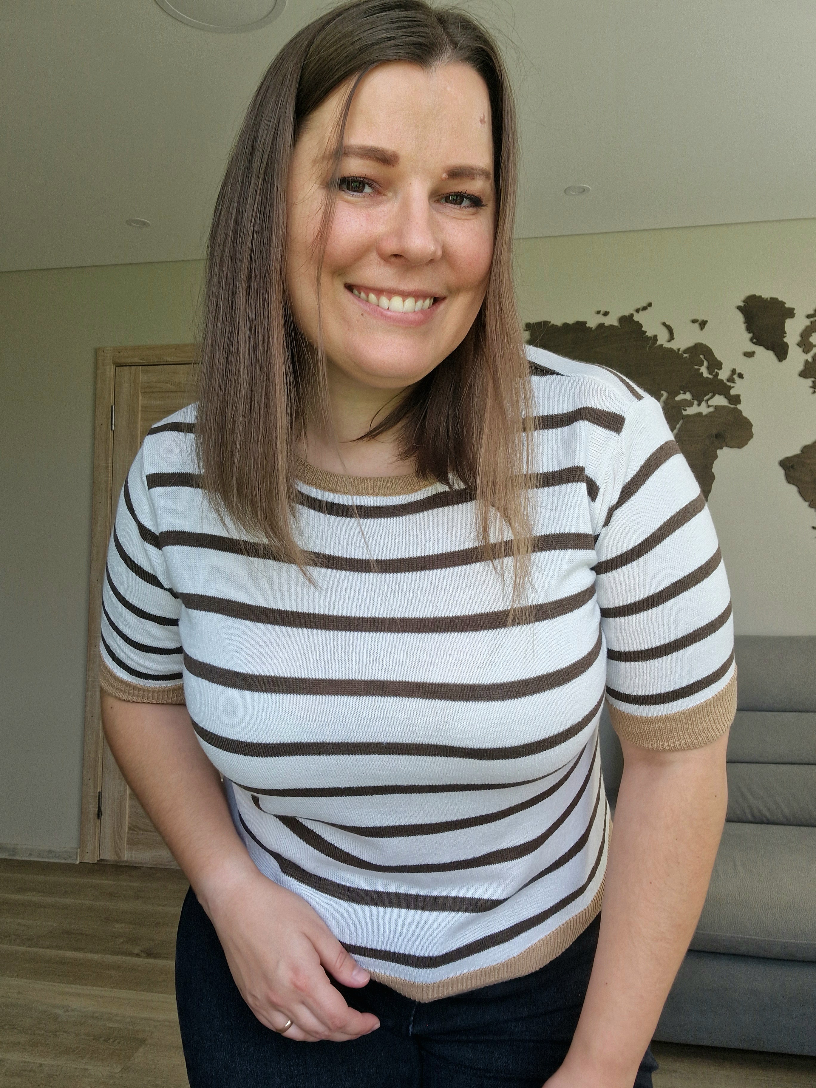 Klasikinis horizontalių juostelių raštas ir neutralios spalvos sukuria universalų ir lengvai derinamą įvaizdį.