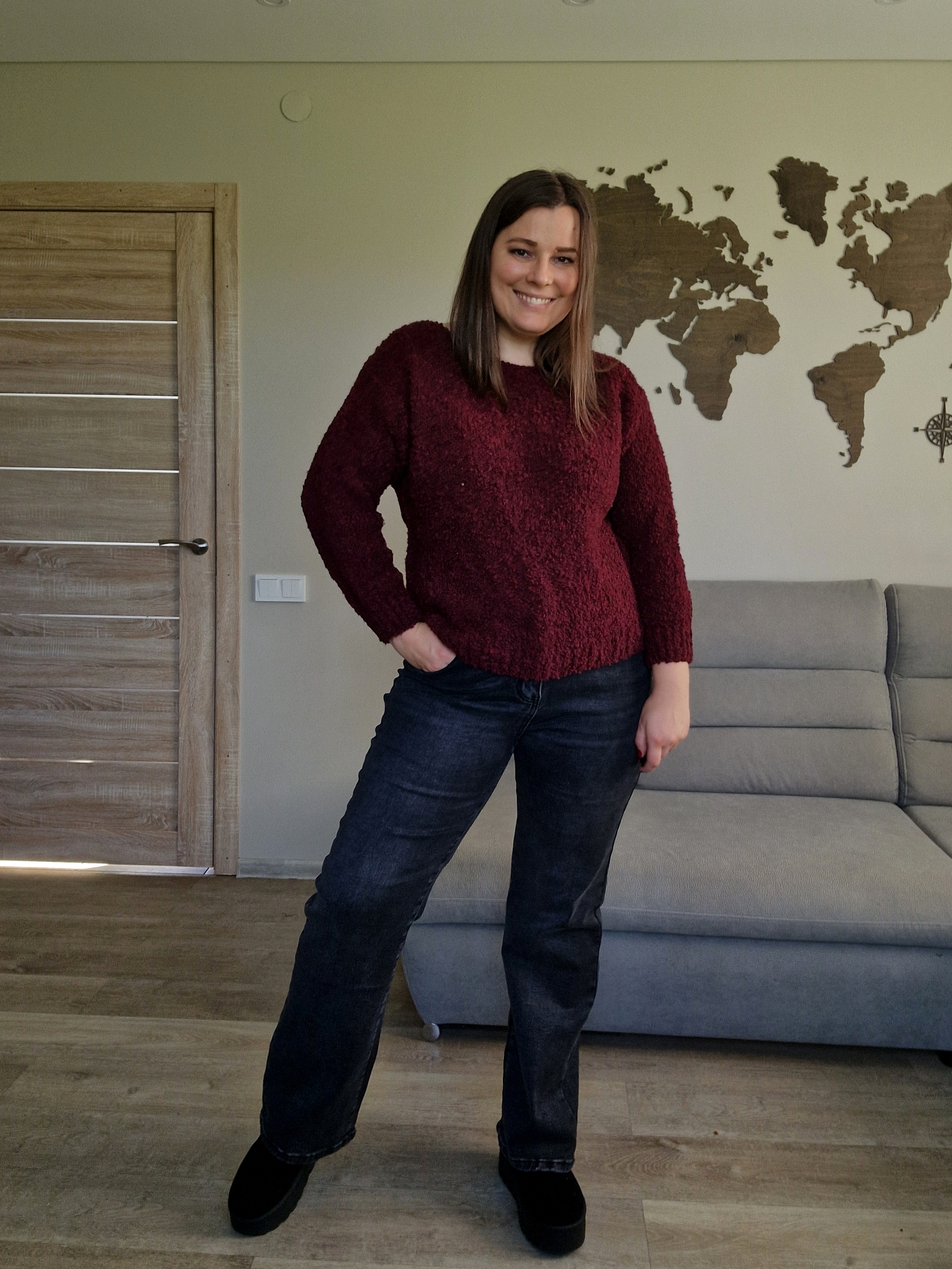 • ​Derinimas: Megztinis puikiai atrodo derinant su tamsiais ar šviesiais džinsais, o po apačia galima dėvėti bodį ar palaidinę.