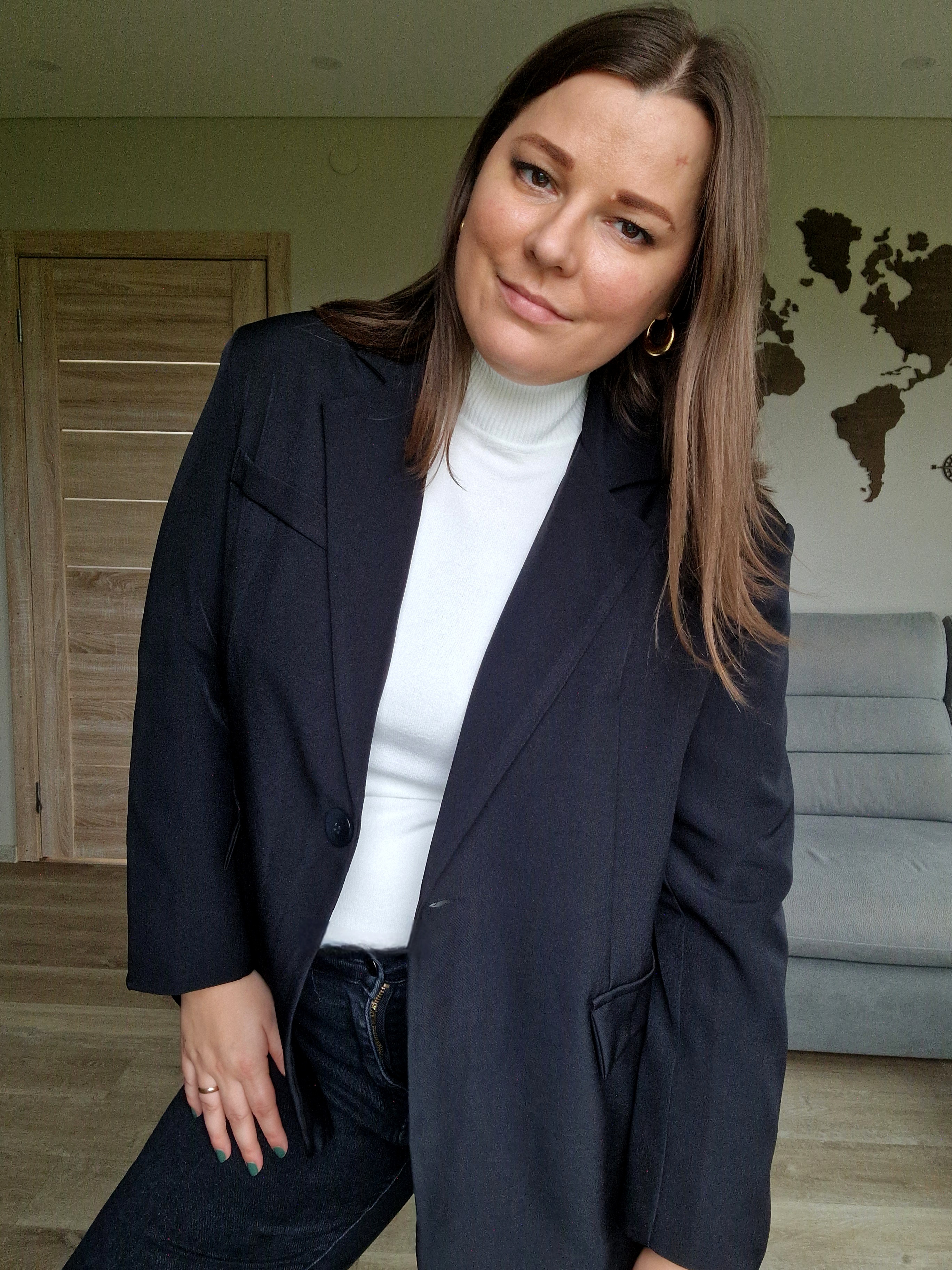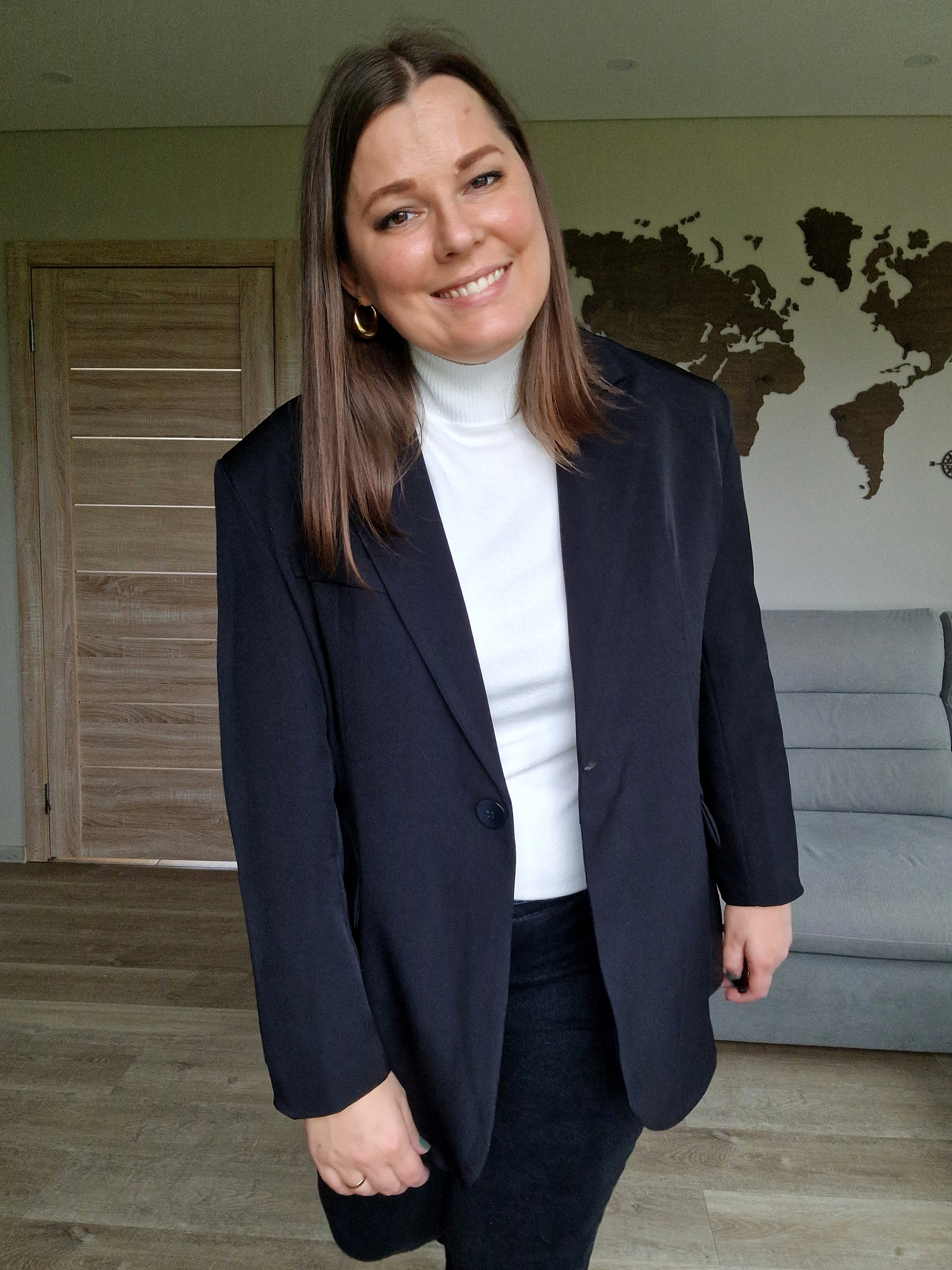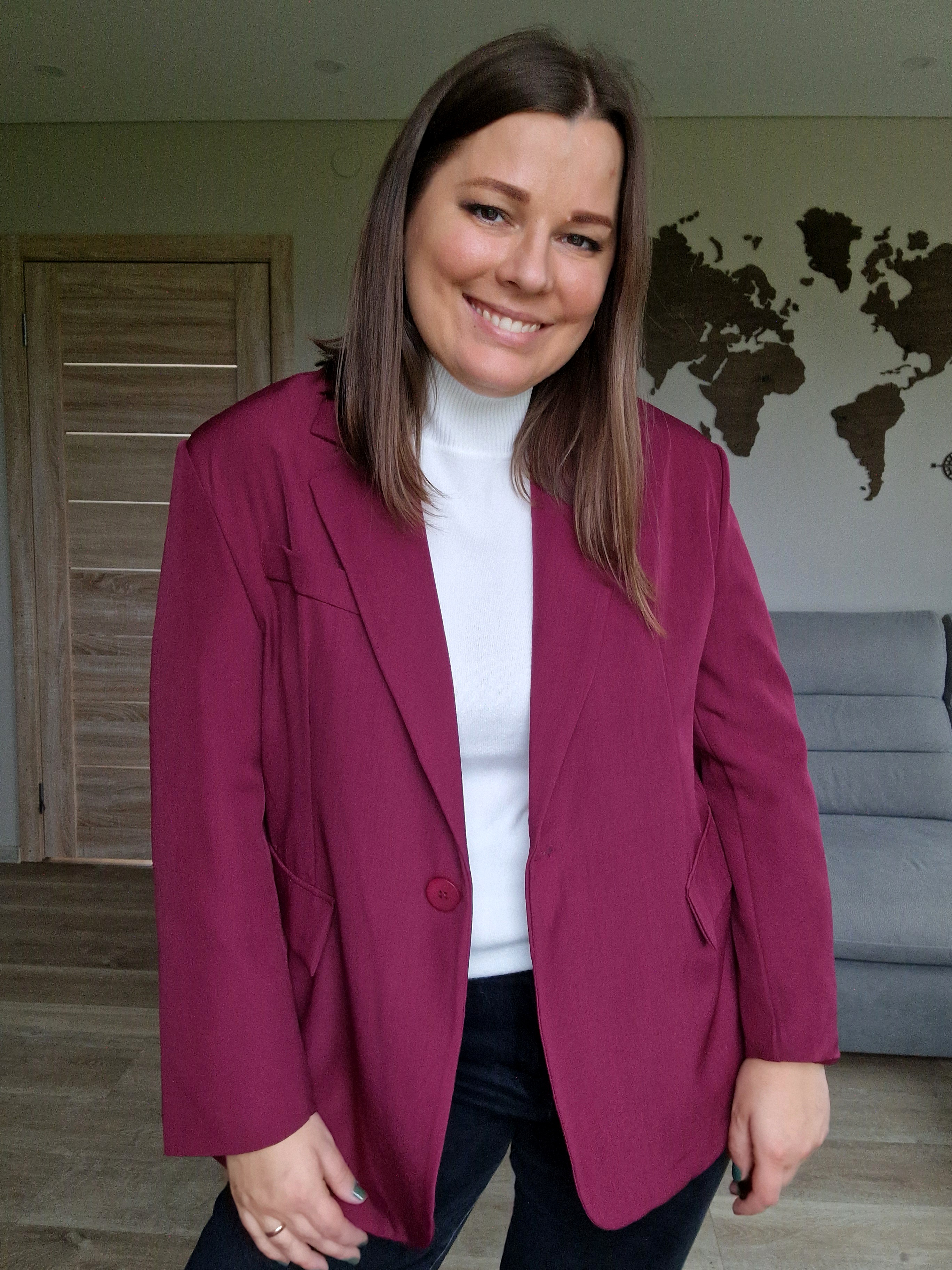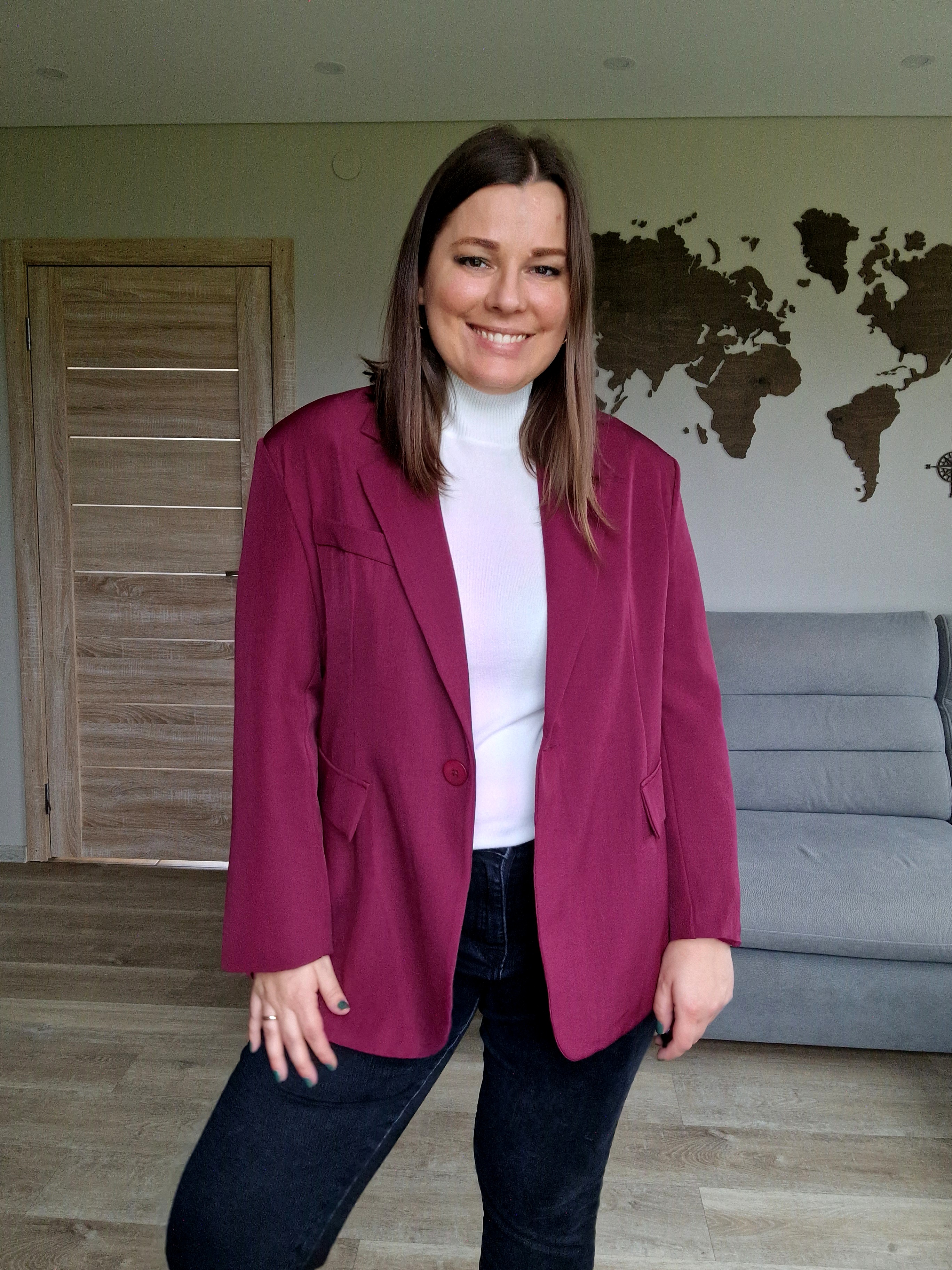 Pristatau stilingą, laisvo kirpimo (oversize) švarką. Puikus pasirinkimas moteriai, vertinančiai kokybę, komfortą ir nepriekaištingą stilių.