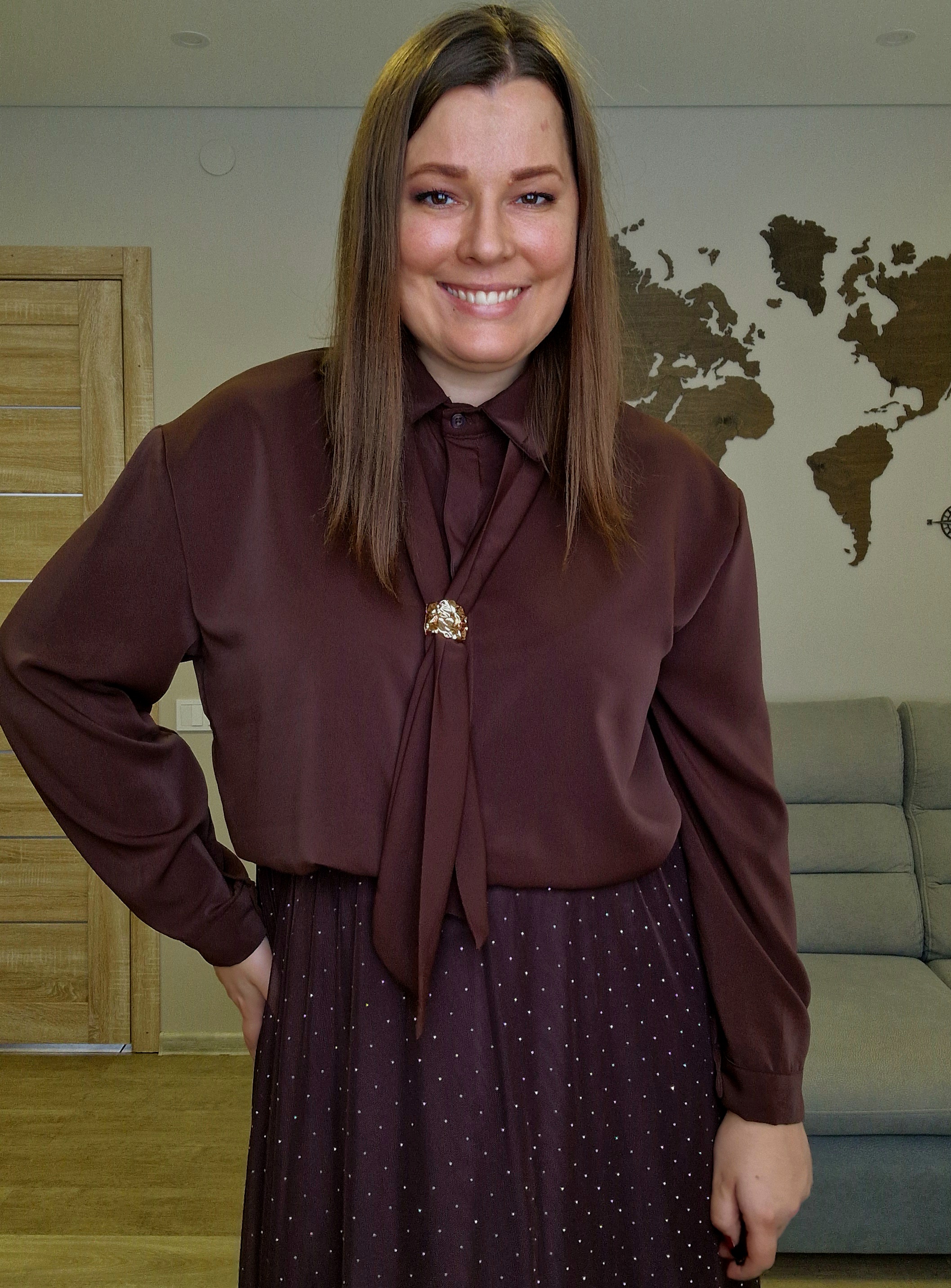 Klasikinis laisvo stiliaus marškinių modelis, kuris yra privaloma modernaus moteriško garderobo dalis. Ir šių marškinukų išskirtinė detalė yra raištelis aplink kaklą su papuošalu, kuris suteikia papildomo puošnumo (galima marškinukus dėvėti ir be raištelio).